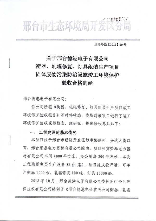 > 新聞動(dòng)態(tài) > 關(guān)于邢臺(tái)德港電子有限公司竣工環(huán)境保護(hù)驗(yàn)收合格的函